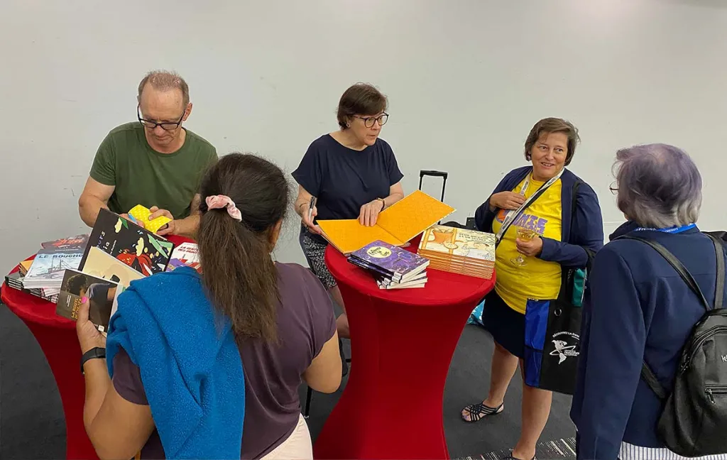 Animé par Martin Francoeur, journaliste au Nouvelliste de Trois-Rivières, le Centre a également offert le panel La justice sociale: comment raconter et rencontrer l’autre par la littérature jeunesse offrant aux enseignantes et enseignants l’occasion d’en apprendre davantage sur le parcours créatif de deux autrices et d’un auteur jeunesse qui ont mis en mots les inégalités sociales : Sarah Ménard (Guadeloupe), Andrée Poulin (Ontario, Canada) et Camille Bouchard (Québec, Canada). Une séance de dédicace a été réalisée avec ces auteurs au salon des exposants. Nous en avons profité pour inviter sur place la Librairie Poirier, une librairie indépendante de Trois-Rivières, afin d’offrir leurs livres ainsi que d’autres ouvrages jeunesse sur la thématique de la justice sociale.